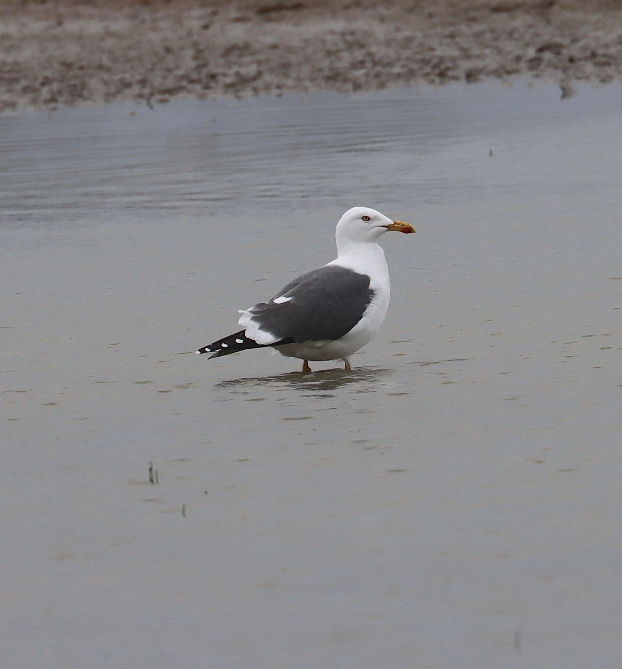 “An interesting Gull on the floods along the Bunk this afternoon. With an off-white mantle and wings, black wing tips and a black tail tip, white head and rump, yellowish legs and a yellow bill with dark tip. Similar size to Lesser Blackbacks present but flew of west before I could get a pic.”